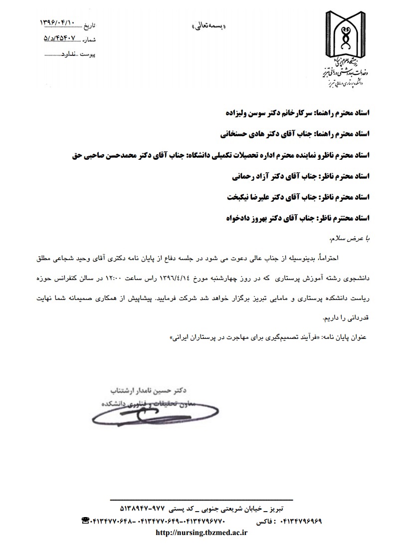 جلسه دفاع از رساله دکترای آقای وحید شجاعی مطلق، دانشجوی دکترای پرستاری