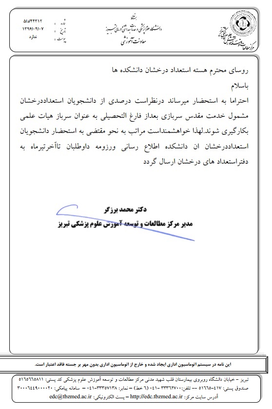 بر اساس اعلام مدیر مرکز مطالعات و توسعه آموزش علوم پزشکی تبریز در نظر است درصدی از دانشجویان استعداد درخشان مشمول خدمت مقدس سربازی بعد از فارغ التحصیلی بعنوان سرباز هیأت علمی بکارگیری شوند.
