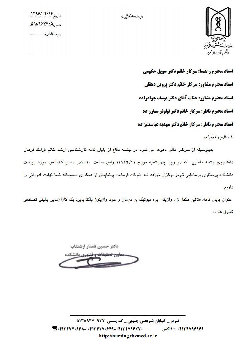 جلسه دفاع از پایاننامه خانم فرانک فرهان، دانشجوی کارشناسی ارشد مامایی