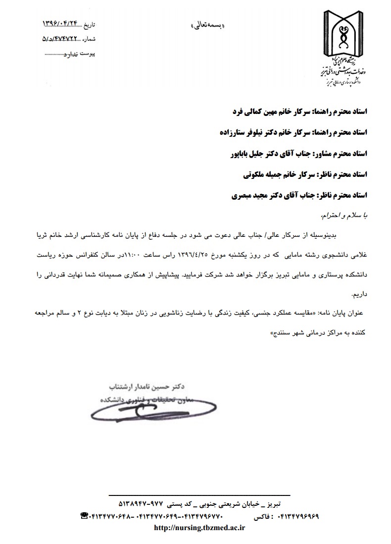 جلسه دفاع از پایاننامه خانم ثریا غلامی، دانشجوی کارشناسی ارشد مامایی