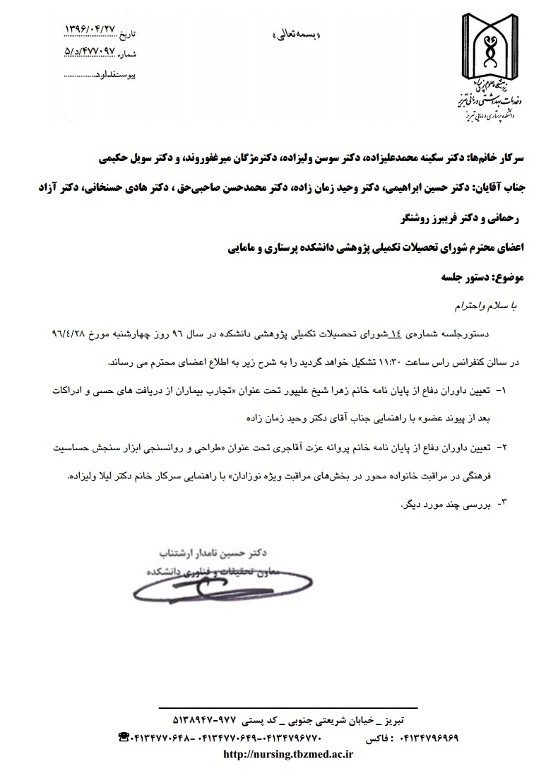 دستور جلسه چهاردهمین شورای تحصیلات تکمیلی پژوهشی دانشکده در سال 96؛ چهارشنبه مورخه 28 تیر