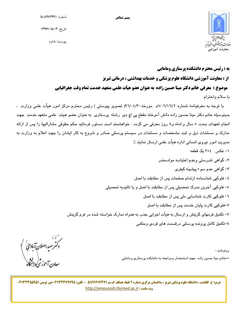 معرفی سرکار خانم دکتر مینا حسین زاده بعنوان عضو هیأت علمی متعهد خدمت