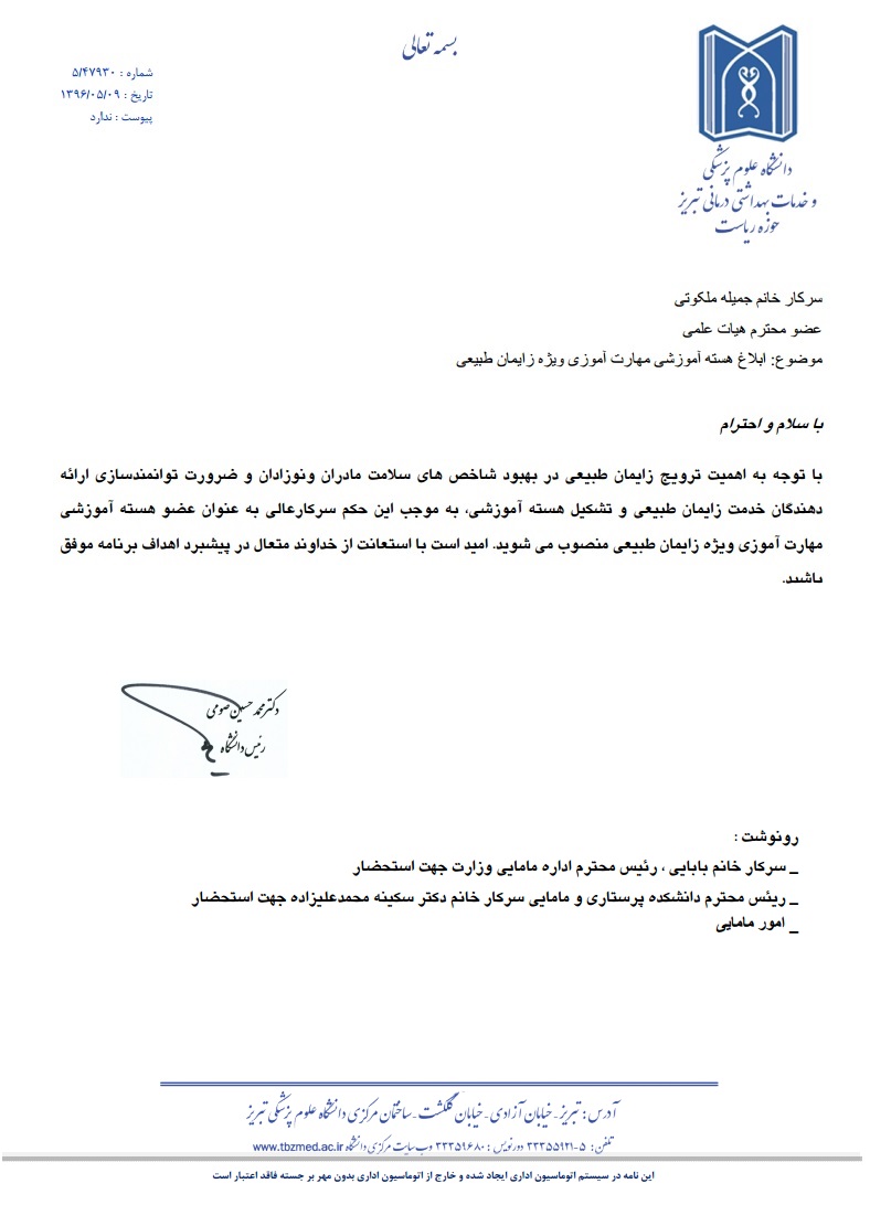 حکم سرکار خانم ملکوتی بعنوان عضو هسته آموزشی مهارت آموزی ویژه زایمان طبیعی