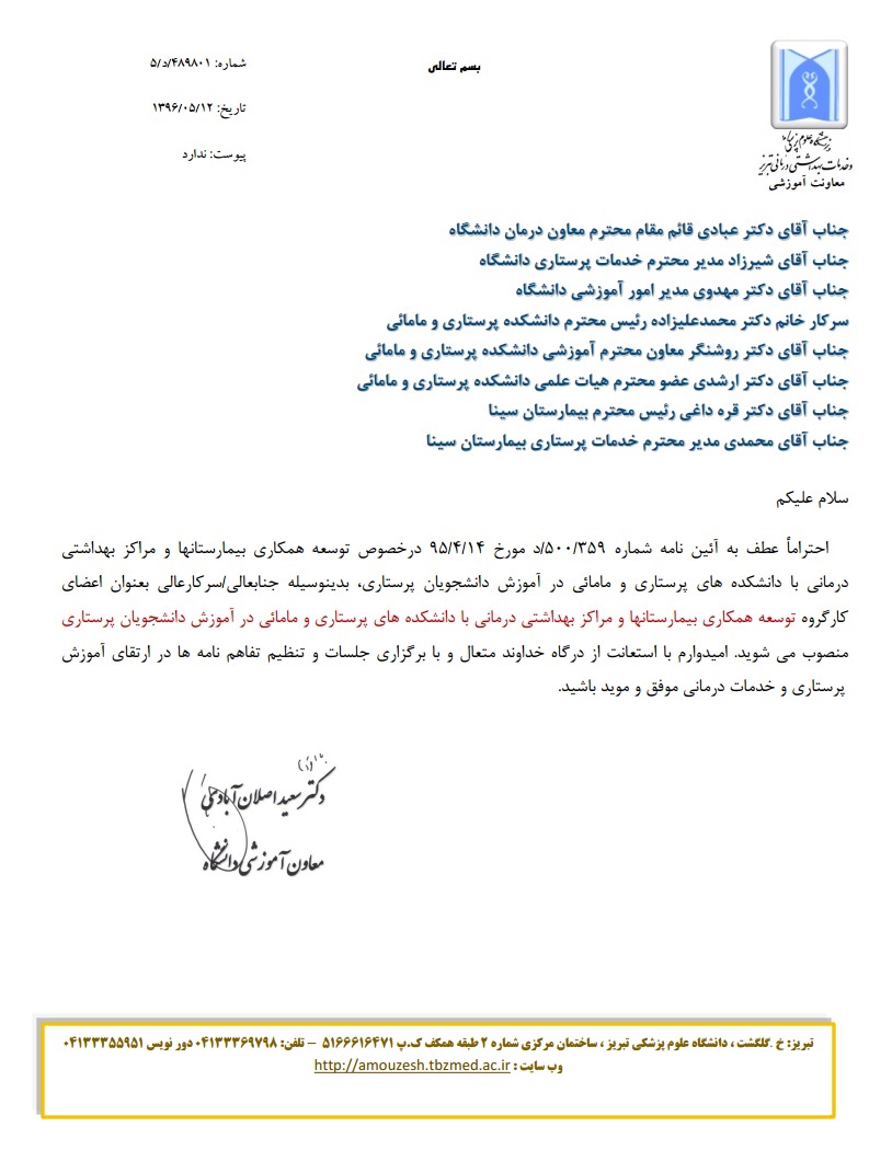 عطف به آئین نامه توسعه همکاری بیمارستانها و مراکز بهداشتی درمانی به دانشکده های پرستاری و مامائی در آموزش دانشجویان پرستاری، تنی چند از اعضای هیات علمی دانشکده بعنوان اعضای کارگروه توسعه همکاری ...