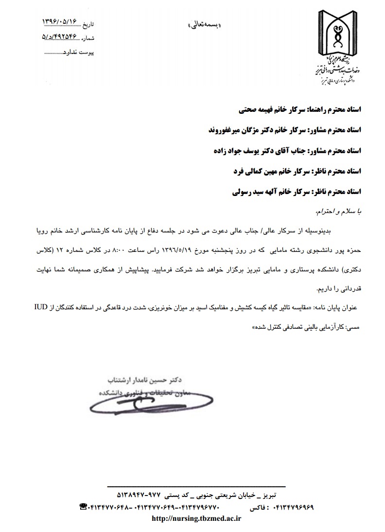 جلسه دفاع از پایاننامه خانم رویا حمزه پور، دانشجوی کارشناسی ارشد مامایی