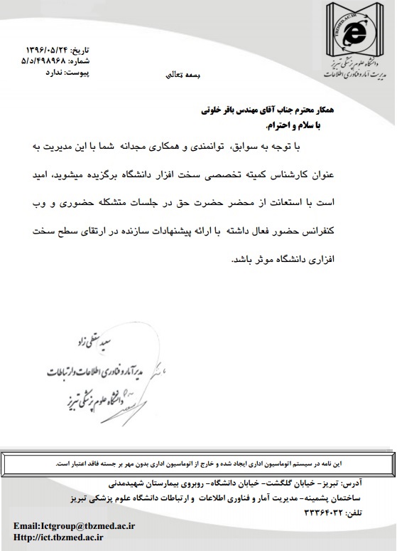 انتخاب جناب آقای مهندس خلوتی بعنوان کارشناس کمیته تخصصی سخت افزار دانشگاه از طرف مدیریت محترم آمار و فناوری اطلاعات و ارتباطات را خدمت ایشان تبریک عرض نموده و از درگاه خداوند منان توفیق روزافزونشان را خواستاریم.