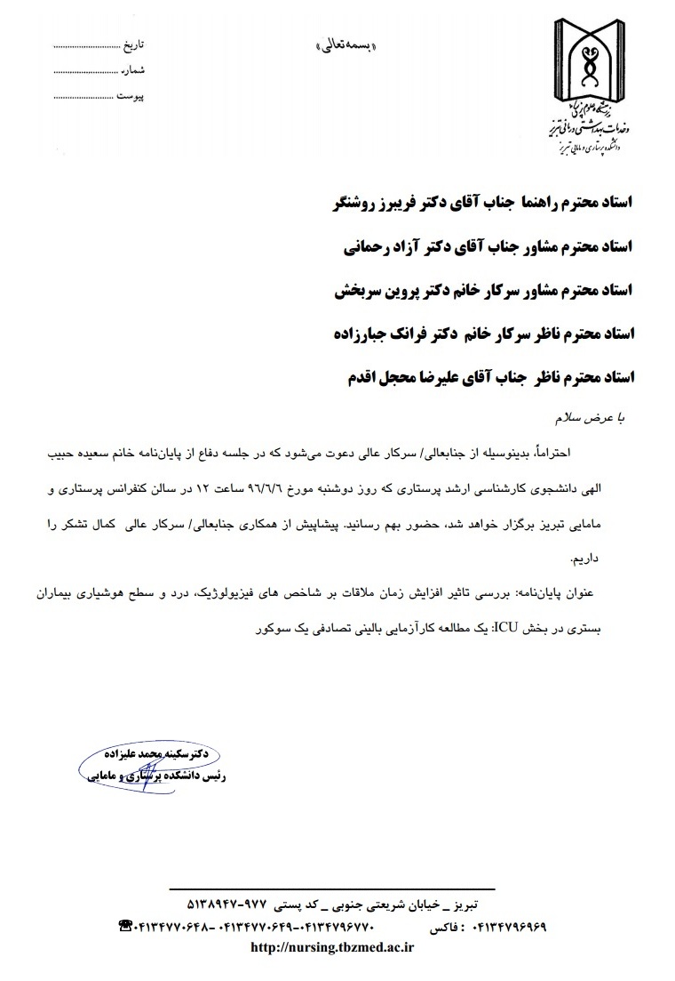 جلسه دفاع از پایاننامه خانم سعیده حبیب الهی، دانشجوی کارشناسی ارشد پرستاری