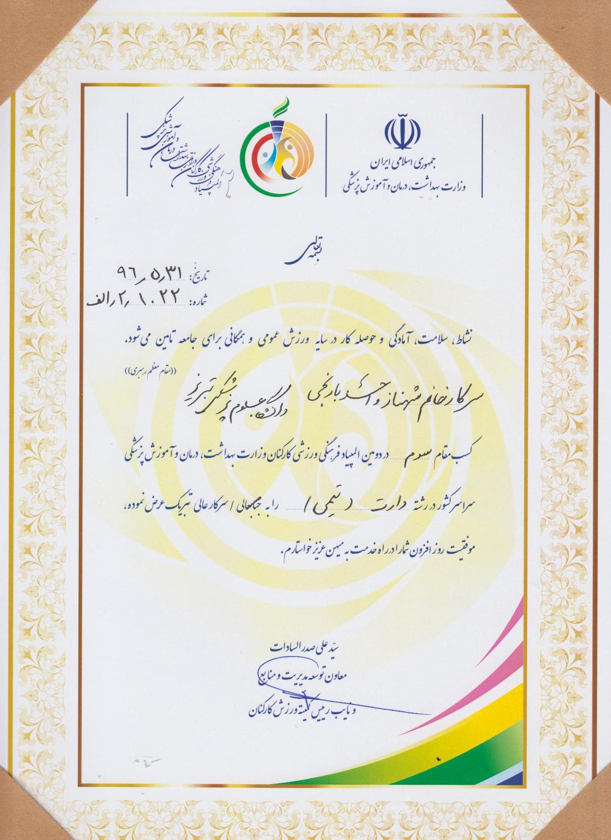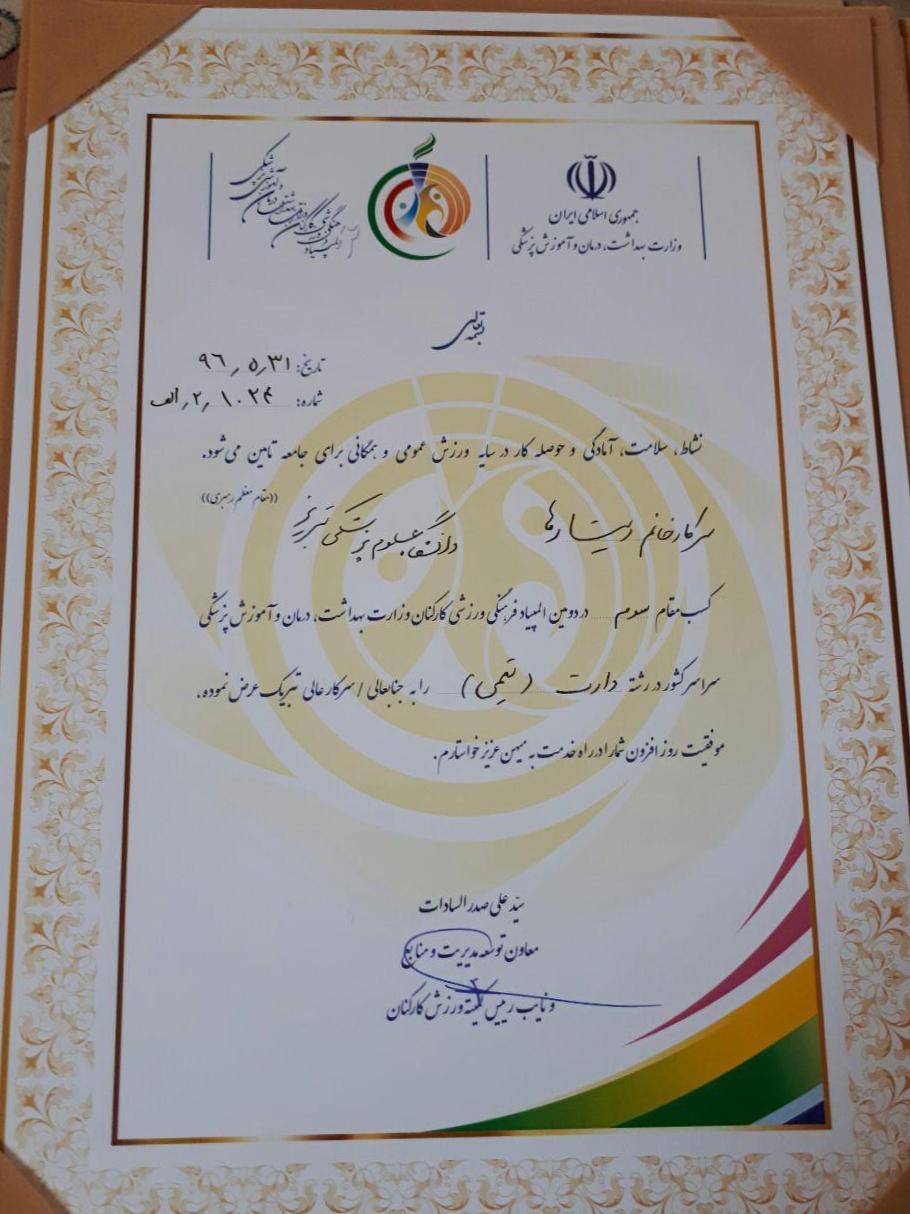 کسب مقام سوم تیم دارت کارکنان دانشگاه علوم پزشکی تبریز در بین 37 تیم شرکت کننده در دومین المپیاد فرهنگی ورزشی کارکنان وزارت بهداشت ویژه بانوان که در مرداد ...3