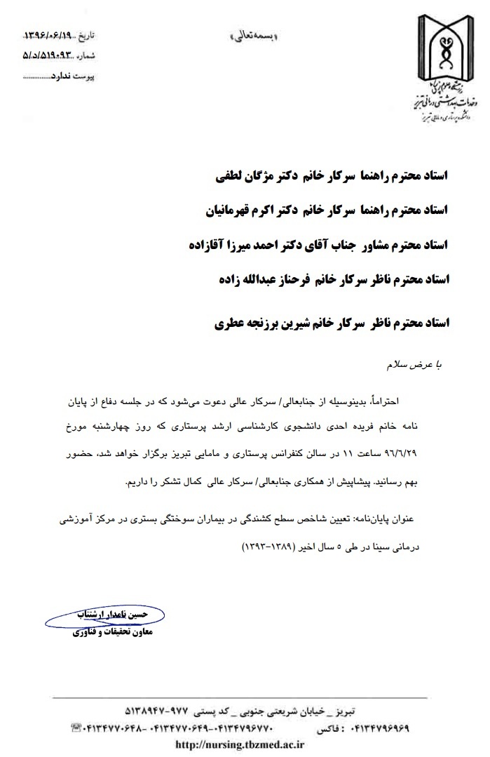 جلسه دفاع از پایاننامه خانم فریده احدی، دانشجوی کارشناسی ارشد پرستاری