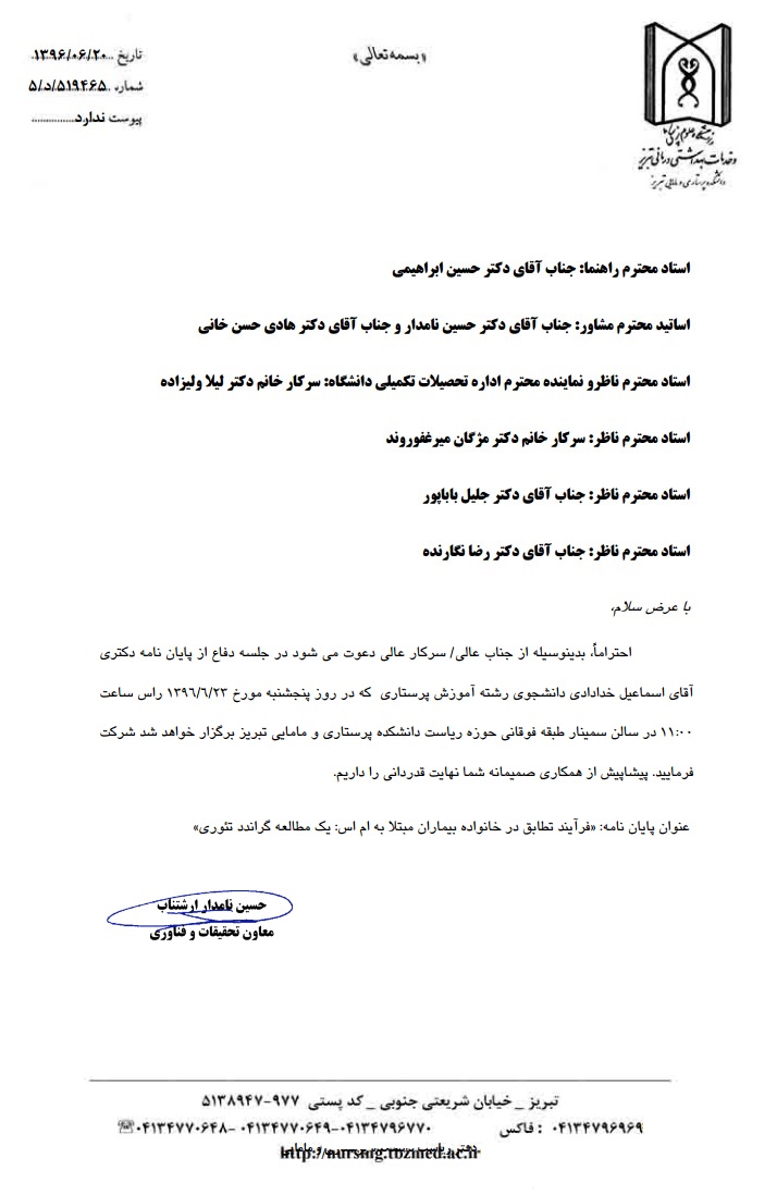 جلسه دفاع از رساله آقای اسماعیل خدادادی، دانشجوی دکترای پرستاری