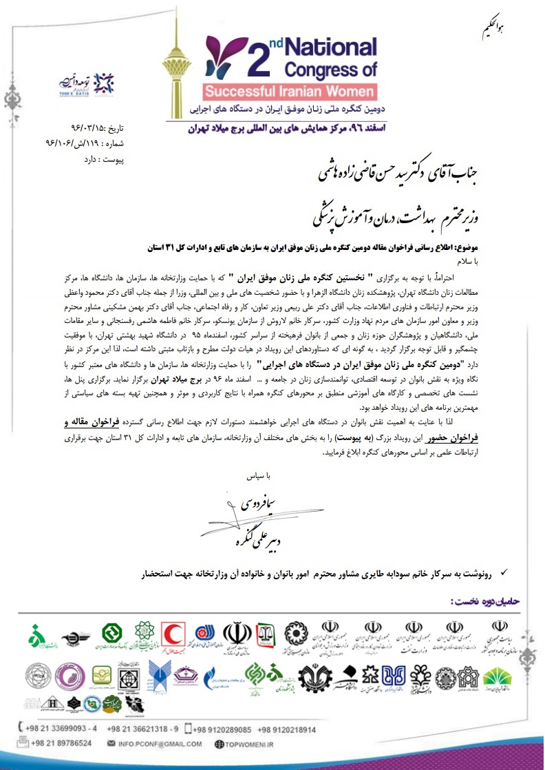 احتراماً با توجه به برگزاری نخستین کنگره ملی زنان موفق ایران که با حمایت وزارتخانه ها، سازمان ها، دانشگاه ها، مراکز مطالعات زنان دانشگاه تهران، پژوهشکده زنان دانشگاه الزهرا و با حضور ...