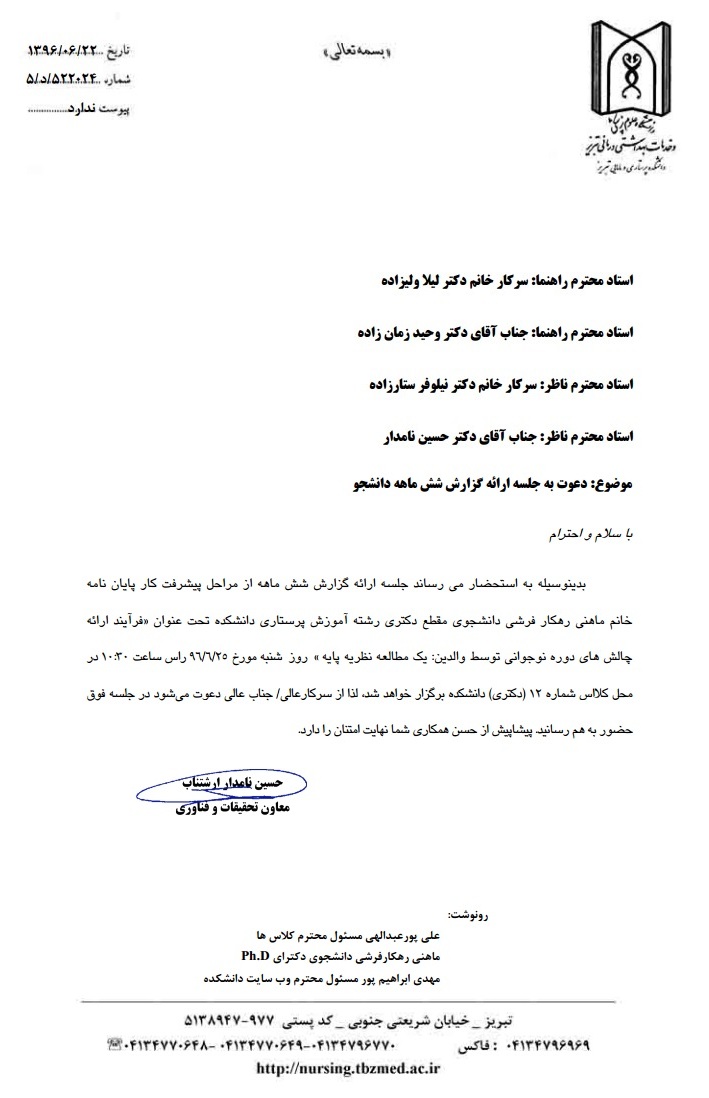 بدینوسیله به استحضار میرساند جلسه ارائه گزارش شش ماهه از مراحل پیشرفت کار رساله خانم ماهنی رهکار، دانشجوی مقطع دکترای رشته آموزش پرستاری تحت عنوان .....