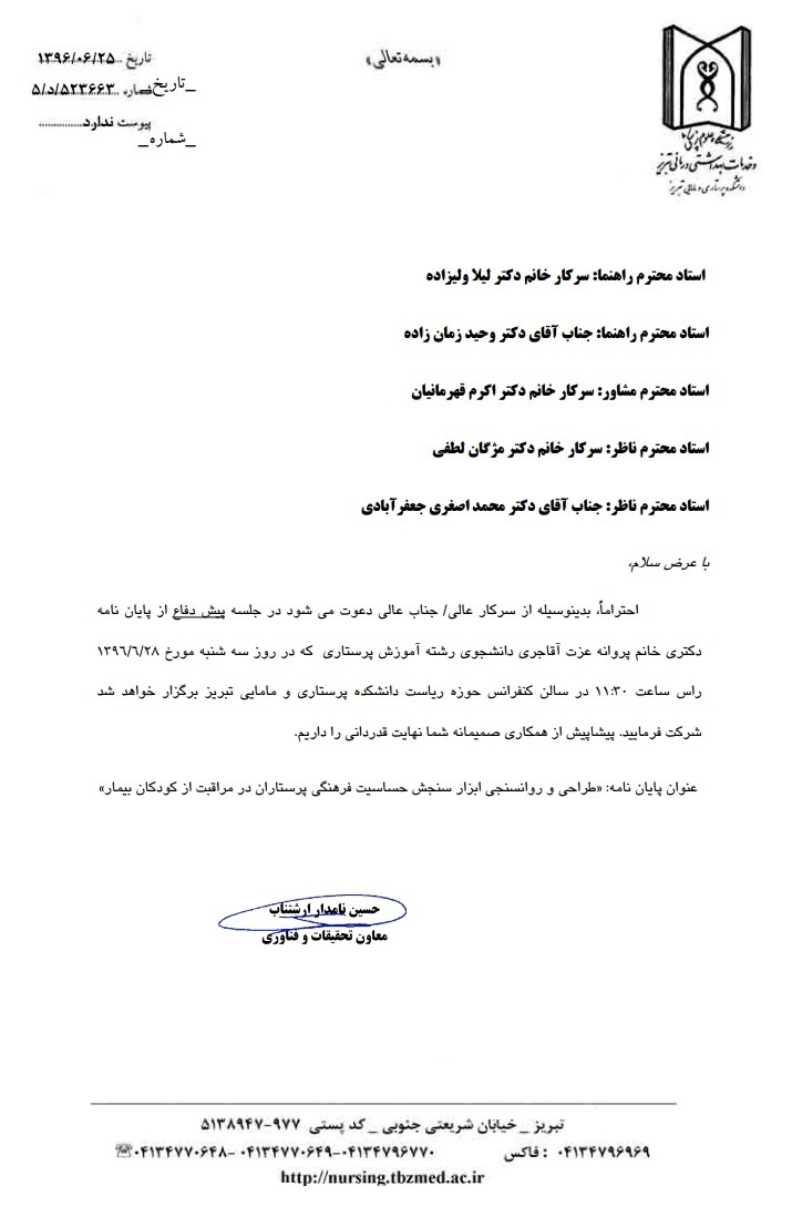 جلسه پیش دفاع از رساله خانم پروانه عزت آقاجری، دانشجوی دکترای پرستاری