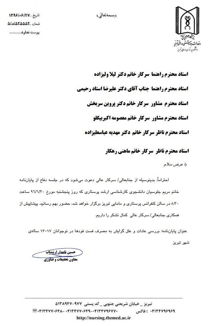 جلسه دفاع از پایاننامه خانم مریم جلوسیان، دانشجوی کارشناسی ارشد پرستاری