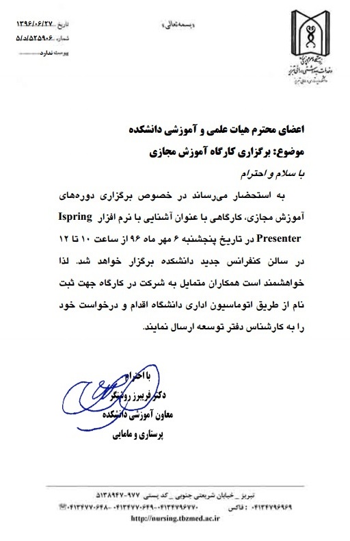 به استحضار می رساند درخصوص برگزاری دوره های آموزش مجازی، کارگاهی با عنوان آشنایی با نرم افزار Ispring Presenter در تاریخ 6 مهرماه از ساعت 10 الی 12 در سالن کنفرانس ...