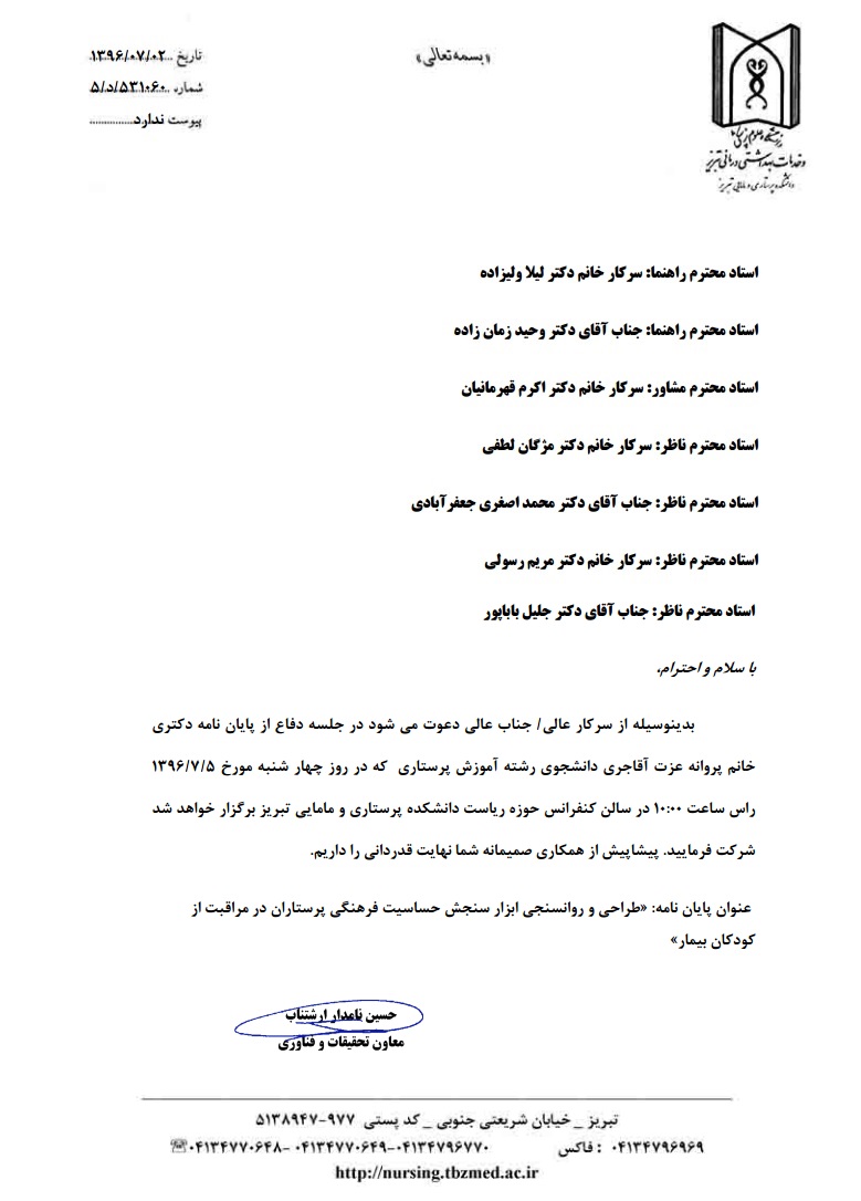 جلسه دفاع از رساله خانم پروانه عزت آقاجری، دانشجوی دکترای پرستاری