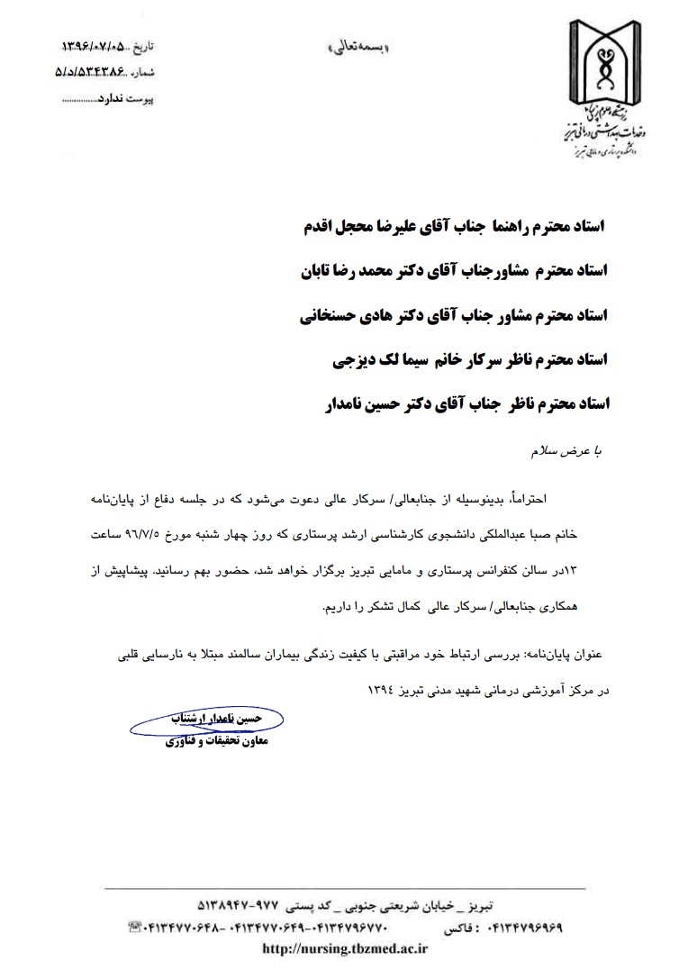 جلسه دفاع از پایاننامه خانم صبا عبدالملکی، دانشجوی کارشناسی ارشد پرستاری