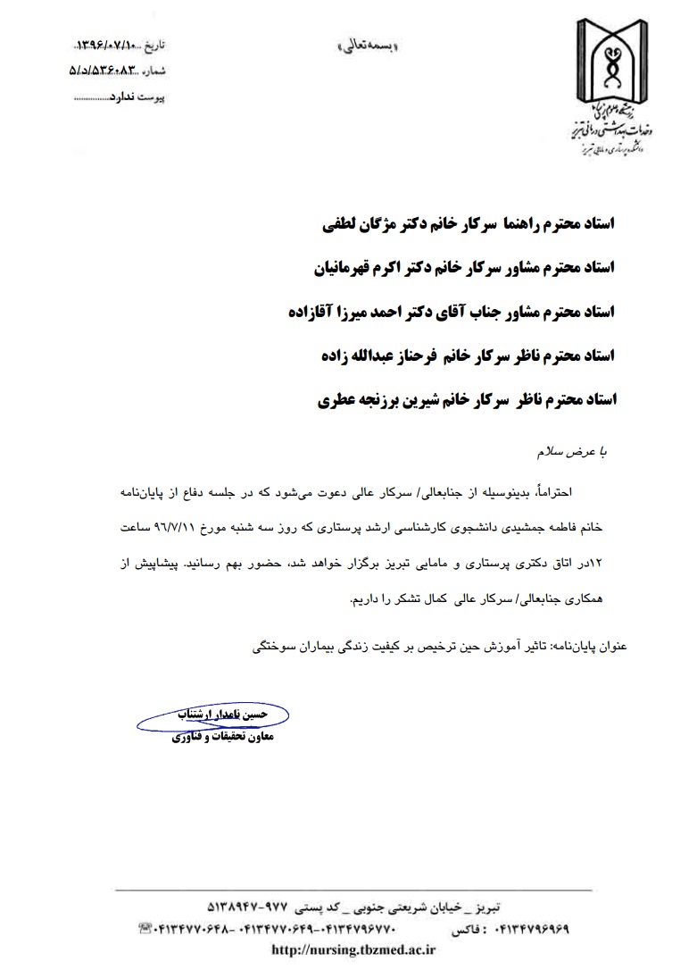 جلسه دفاع از پایاننامه خانم فاطمه جمشیدی، دانشجوی کارشناسی ارشد پرستاری