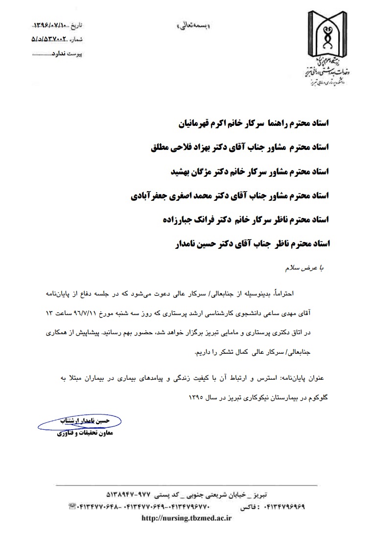جلسه دفاع از پایاننامه آقای مهدی ساعی، دانشجوی کارشناسی ارشد پرستاری