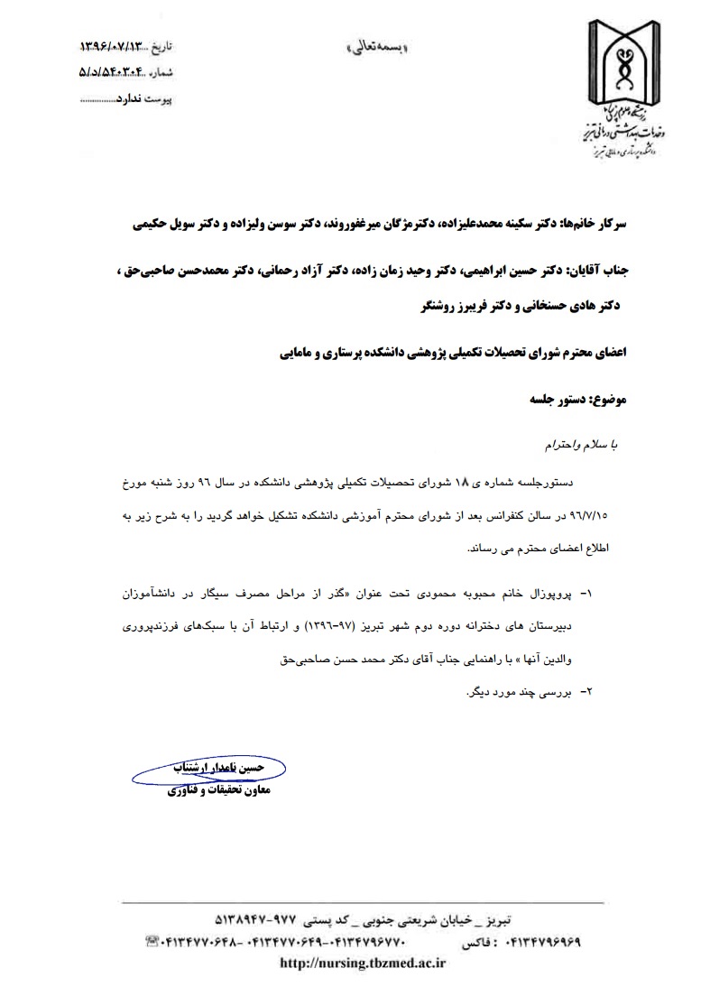 دستور جلسه هجدهمین شورای تحصیلات تکمیلی پژوهشی دانشکده در سال 96؛ شنبه مورخه 15 مهر