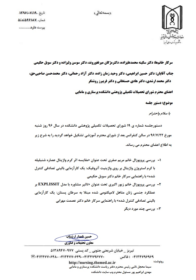 دستور جلسه نوزدهمین شورای تحصیلات تکمیلی پژوهشی دانشکده در سال 96؛ شنبه مورخه 22 مهر