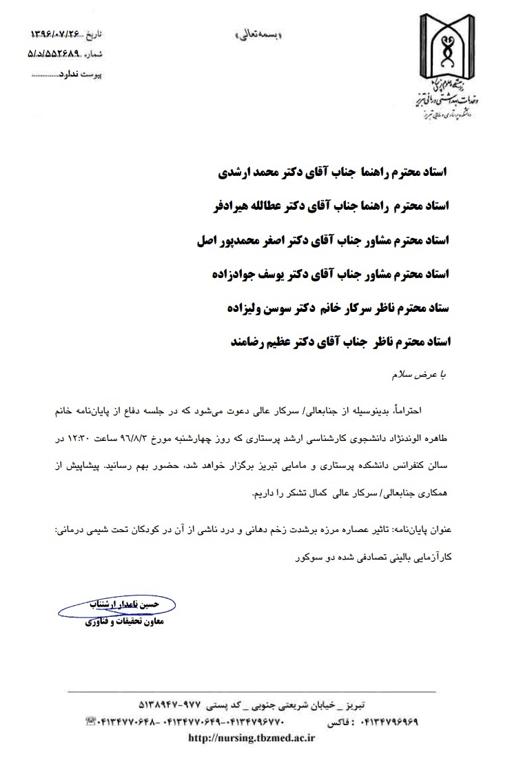 جلسه دفاع از پایاننامه خانم طاهره الوند نژاد، دانشجوی کارشناسی ارشد پرستاری