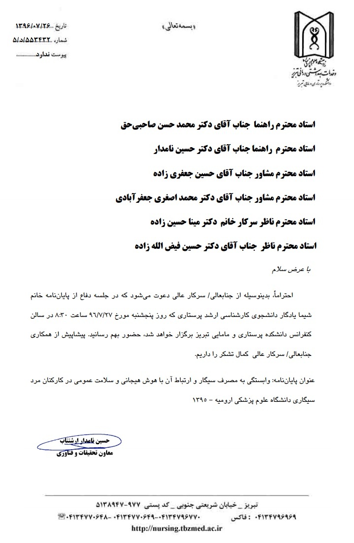 جلسه دفاع از پایاننامه خانم شیما یادگار، دانشجوی کارشناسی ارشد پرستاری
