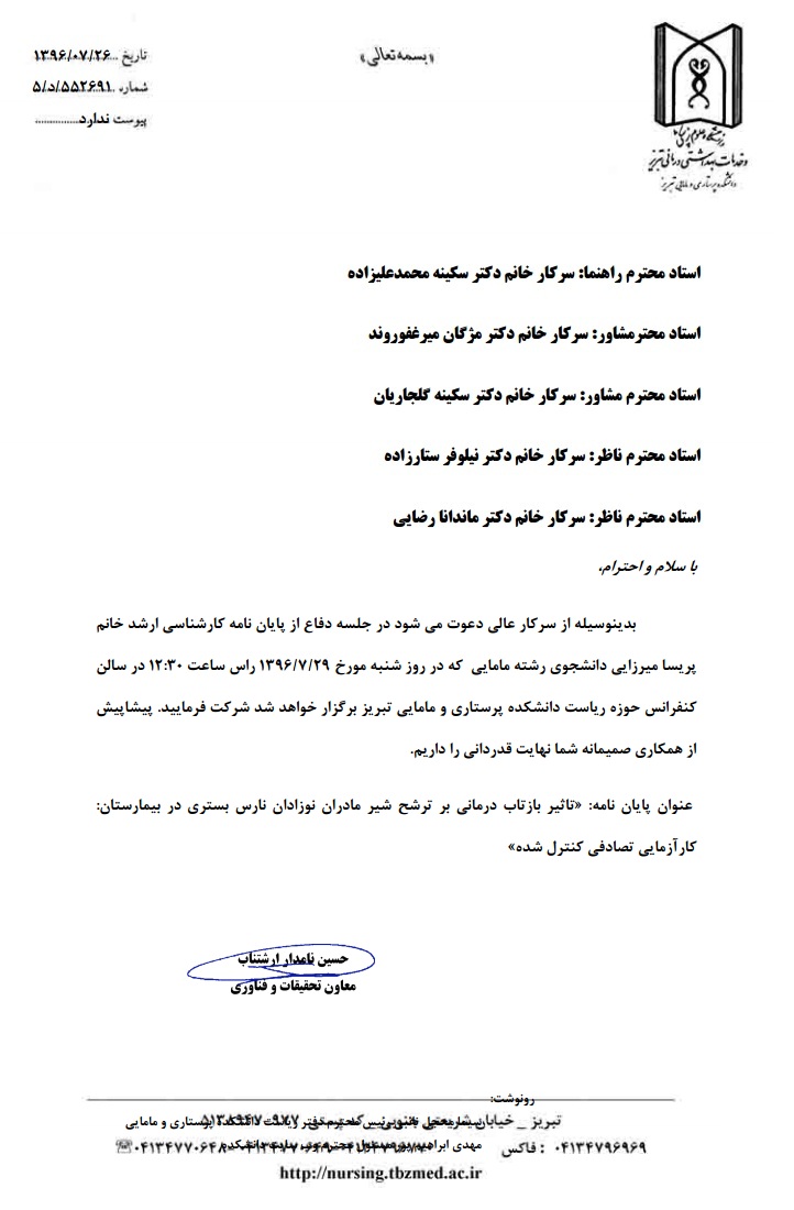 جلسه دفاع از پایاننامه خانم پریسا میرزایی، دانشجوی کارشناسی ارشد مامایی