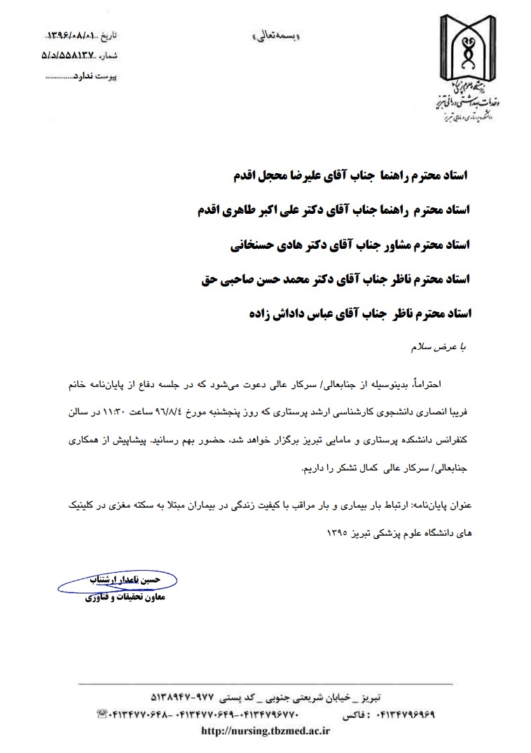 جلسه دفاع از پایاننامه خانم فریبا انصاری، دانشجوی کارشناسی ارشد پرستاری