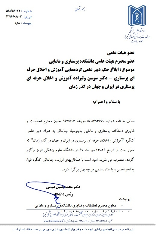 ریاست دانشگاه با ارسال نامه ای، سرکار خانم دکتر سوسن ولیزاده، عضو هیأت علمی دانشکده را بعنوان دبیر علمی کنگره "آموزش و اخلاق حرفه ای پرستاری در ایران و جهان در گذر زمان" که مقرر است از تاریخ ...