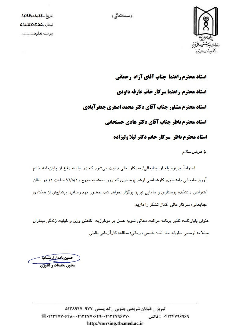 جلسه دفاع از پایاننامه خانم آرزو خانجانی، دانشجوی کارشناسی ارشد پرستاری