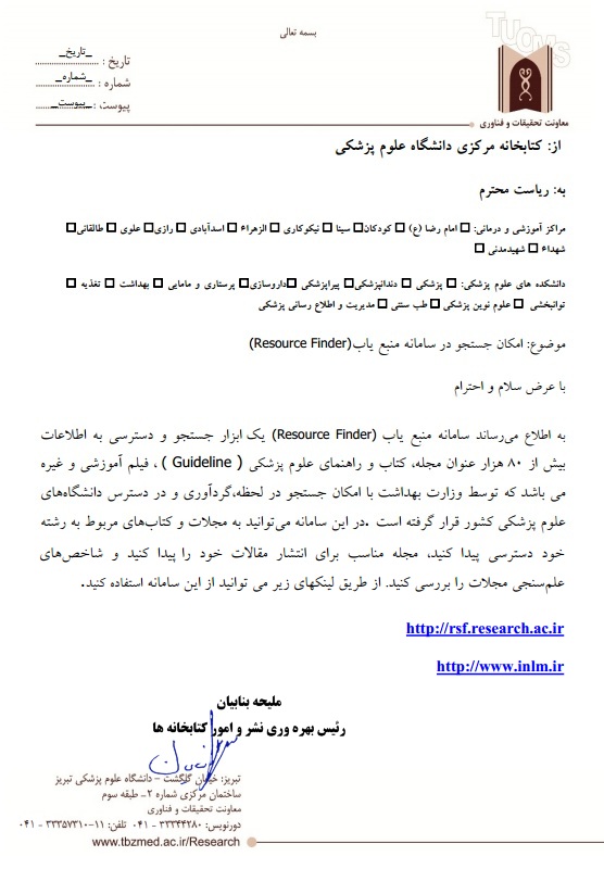 به اطلاع می رساند سامانه منبع یاب (Resource Finder) یک ابزار جستجو و دسترسی به اطلاعات بیش از 80 هزار عنوان مجله، کتاب و راهنمای علوم پزشکی (Guideline)، فیلم آموزشی و ... می باشد که توسط وزارت بهداشت ...