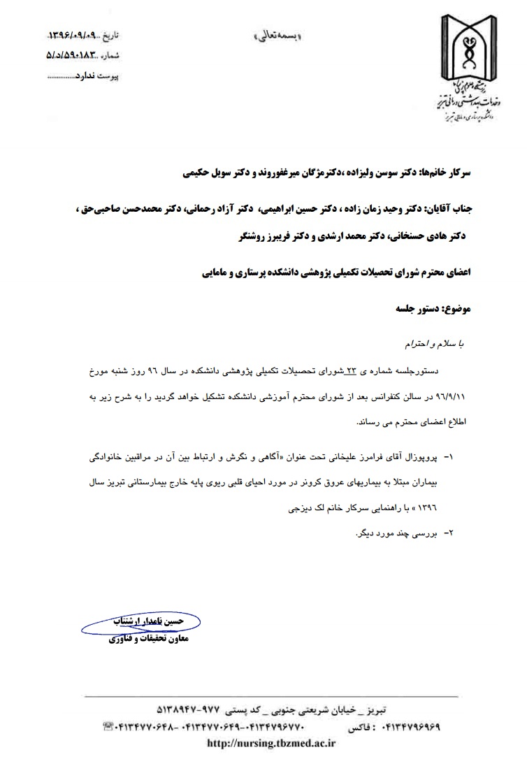 دستور جلسه بیست و سومین شورای تحصیلات تکمیلی پژوهشی دانشکده در سال 96؛ شنبه مورخه 11 آذر