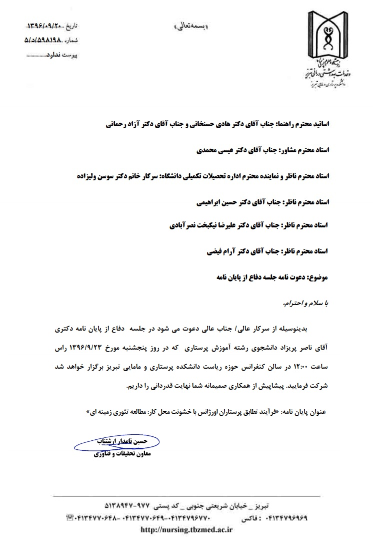 جلسه دفاع رساله دکترای آقای ناصر پریزاد، دانشجوی دکترای پرستاری، روز پنجشنبه مورخه 23 آذر 96