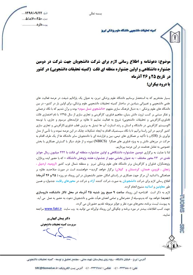 به استحضار میرساند دانشگاه علوم پزشکی تبریز بعنوان یک پارادایم شیفت در عرصه فعالیتهای علمی دانشجویی و تغییراتی بنیادین در ساختار کمیته تحقیقات دانشجویی علوم پزشکی برای اولین بار ...