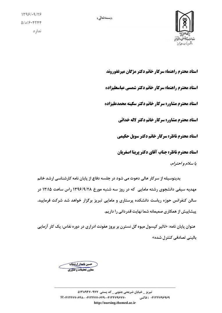 جلسه دفاع از پایاننامه خانم مهدیه سیفی، دانشجوی کارشناسی ارشد مامایی