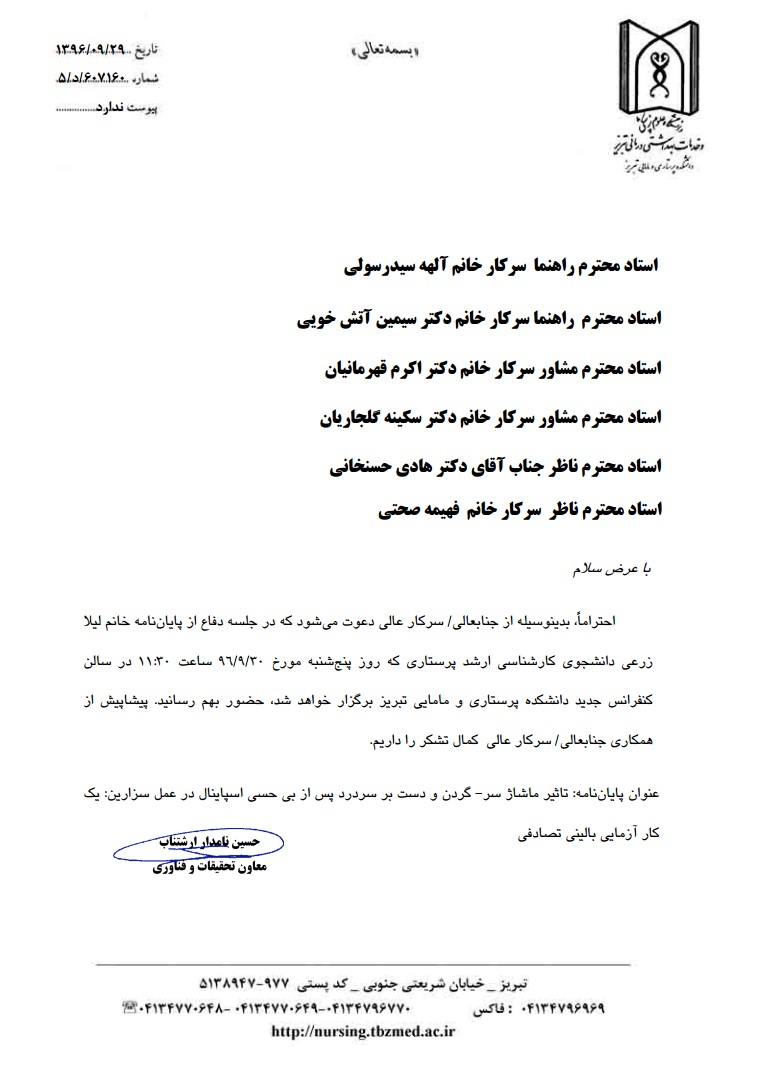 جلسه دفاع از پایاننامه خانم لیلا زرعی، دانشجوی کارشناسی ارشد پرستاری