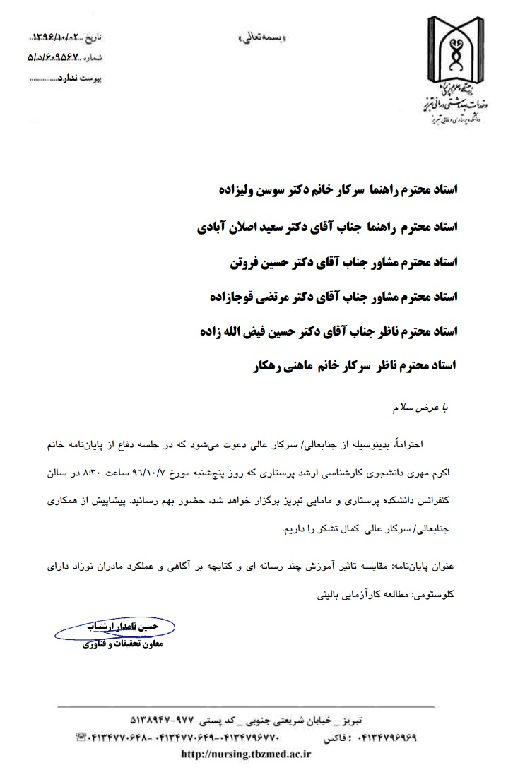 جلسه دفاع از پایاننامه خانم اکرم مهری، دانشجوی کارشناسی ارشد پرستاری