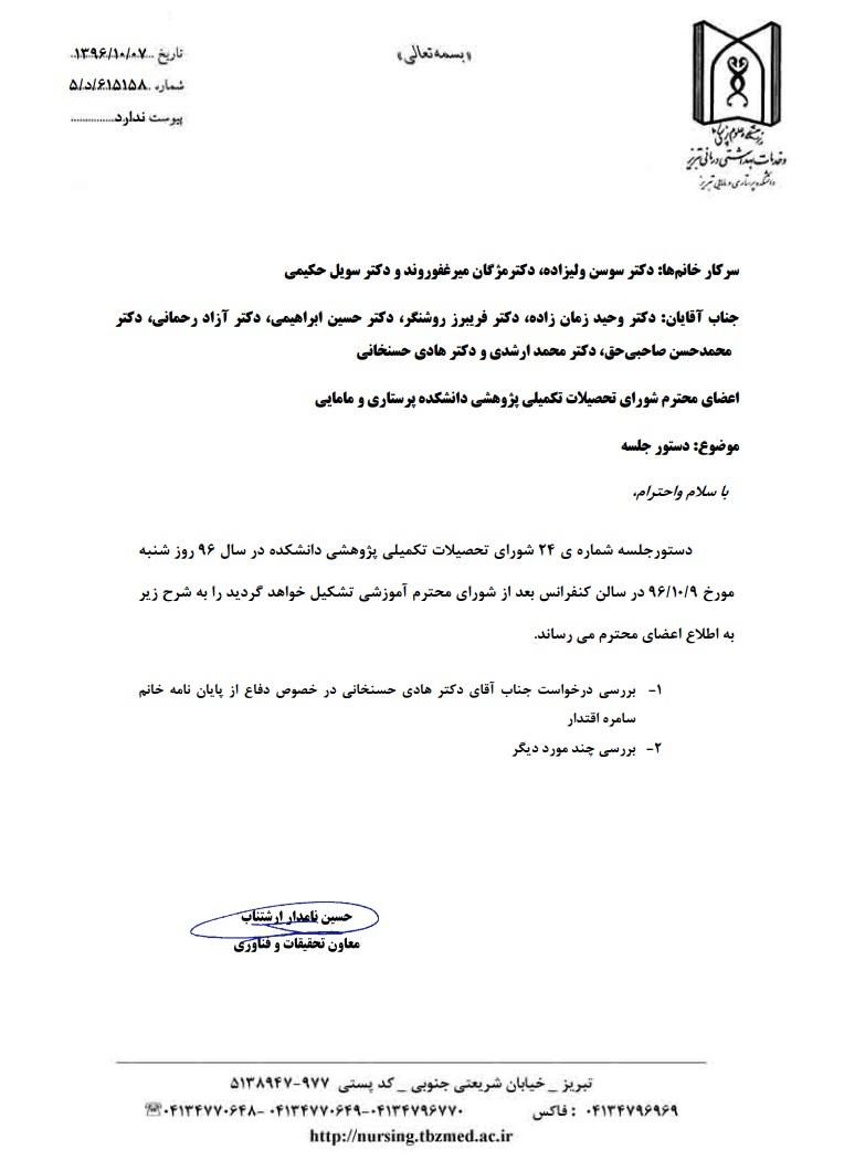 دستور جلسه بیست و چهارمین شورای تحصیلات تکمیلی پژوهشی دانشکده در سال 96؛ شنبه مورخه 9 دی