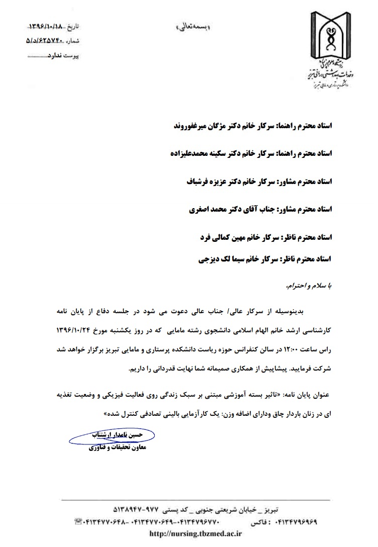 جلسه دفاع از پایاننامه خانم الهام اسلامی، دانشجوی کارشناسی ارشد مامایی