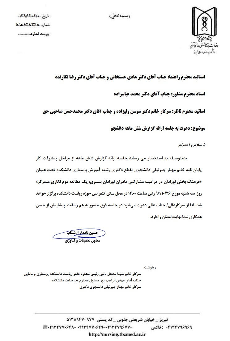 بدینوسیله به استحضار میرساند جلسه ارائه گزارش شش ماهه از مراحل پیشرفت کار رساله خانم مهناز جبرئیلی، دانشجوی مقطع دکترای رشته آموزش پرستاری تحت عنوان .....