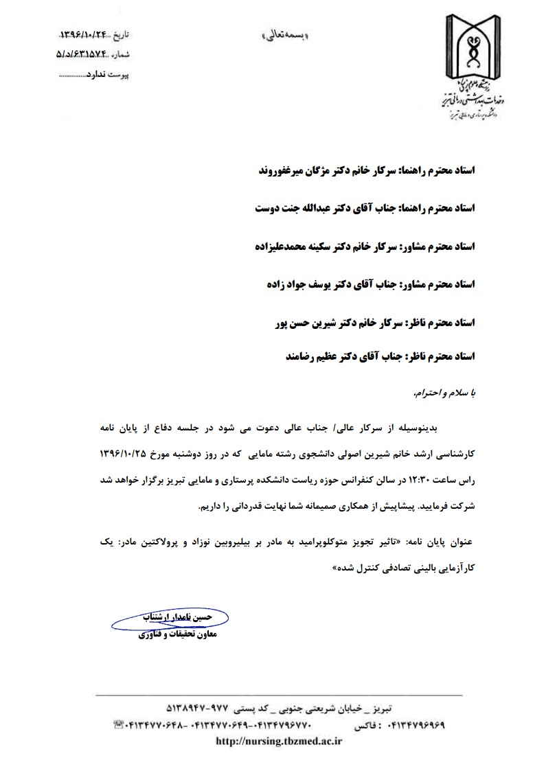 جلسه دفاع از پایاننامه خانم شیرین اصولی، دانشجوی کارشناسی ارشد مامایی