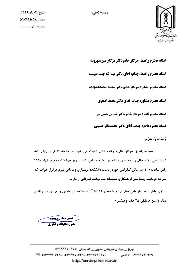 جلسه دفاع از پایاننامه خانم ربابه سیدی، دانشجوی کارشناسی ارشد مامایی