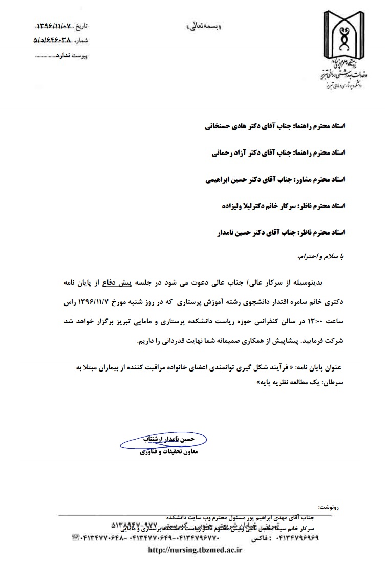 جلسه پیش دفاع از رساله خانم سامره اقتدار، دانشجوی دکترای پرستاری