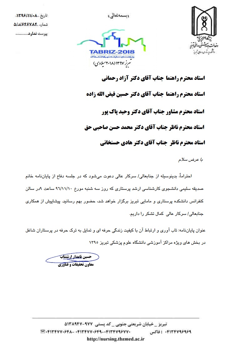 جلسه دفاع از پایاننامه خانم صدیقه سلیمی، دانشجوی کارشناسی ارشد پرستاری