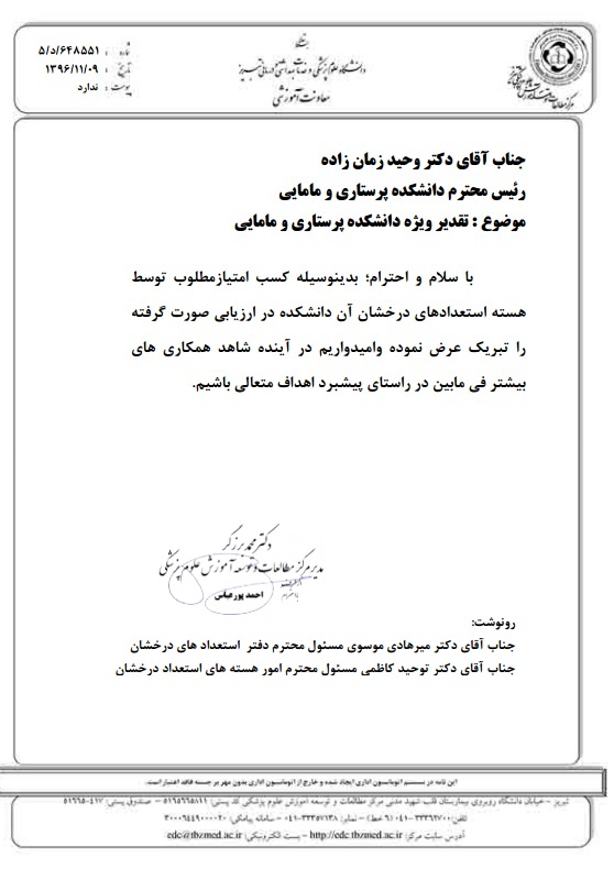 بدینوسیله کسب امتیاز مطلوب توسط هسته استعدادهای درخشان دانشکده در ارزیابی صورت گرفته از سوی مرکز مطالعات و توسعه آموزش علوم پزشکی دانشگاه را خدمت مسئولین ذیربط و کلیه همکاران دانشکده ...