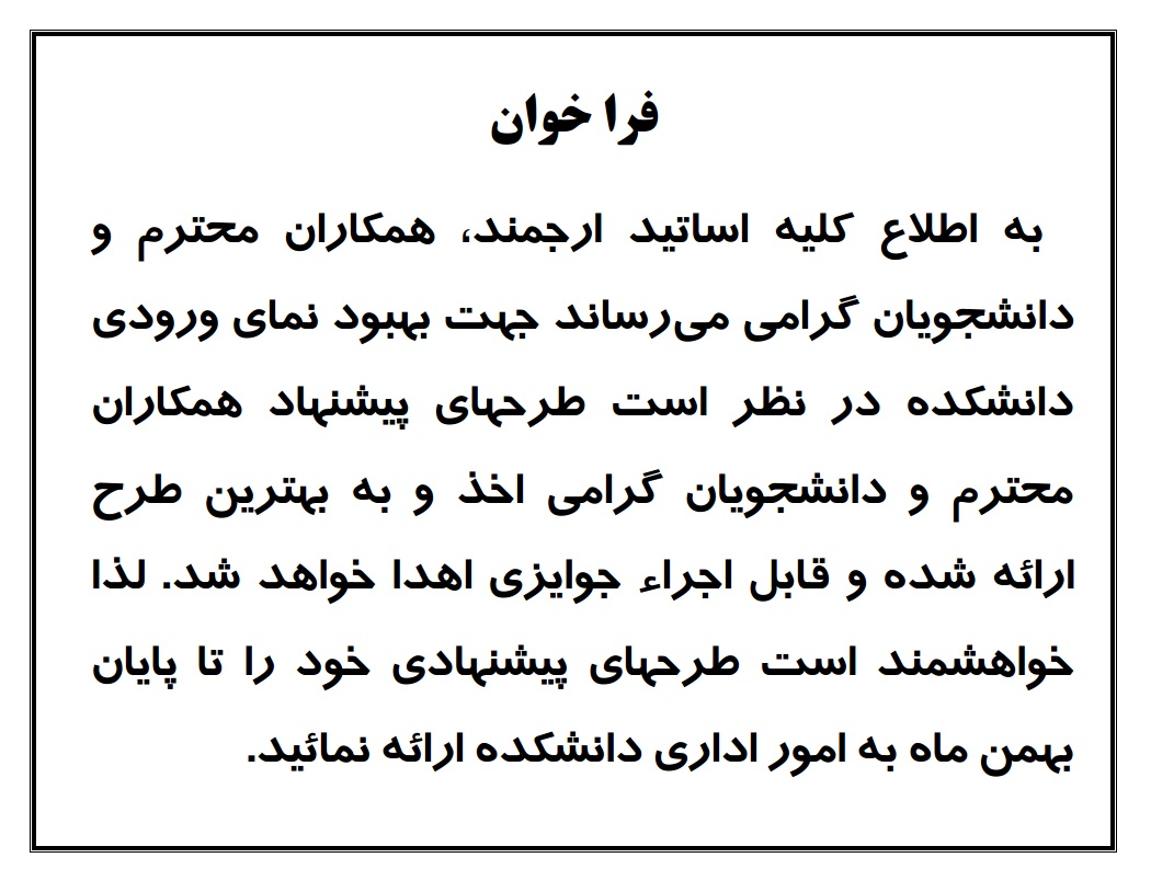 به اطلاع کلیه همکاران و دانشجویان گرامی میرساند جهت بهبود نمای ورودی دانشکده در نظر است طرح های پیشنهادی همکاران محترم و دانشجویان گرامی اخذ و به بهترین طرح ارائه شده و ...