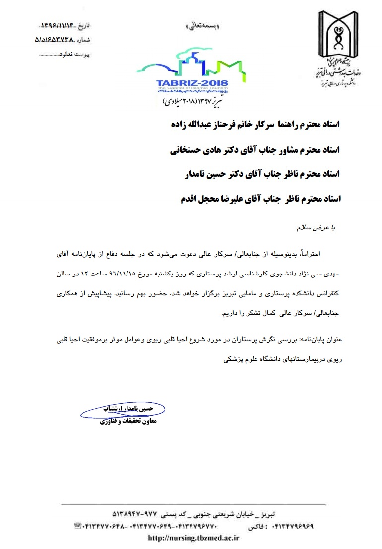 جلسه دفاع از پایاننامه آقای مهدی ممی نژاد، دانشجوی کارشناسی ارشد پرستاری