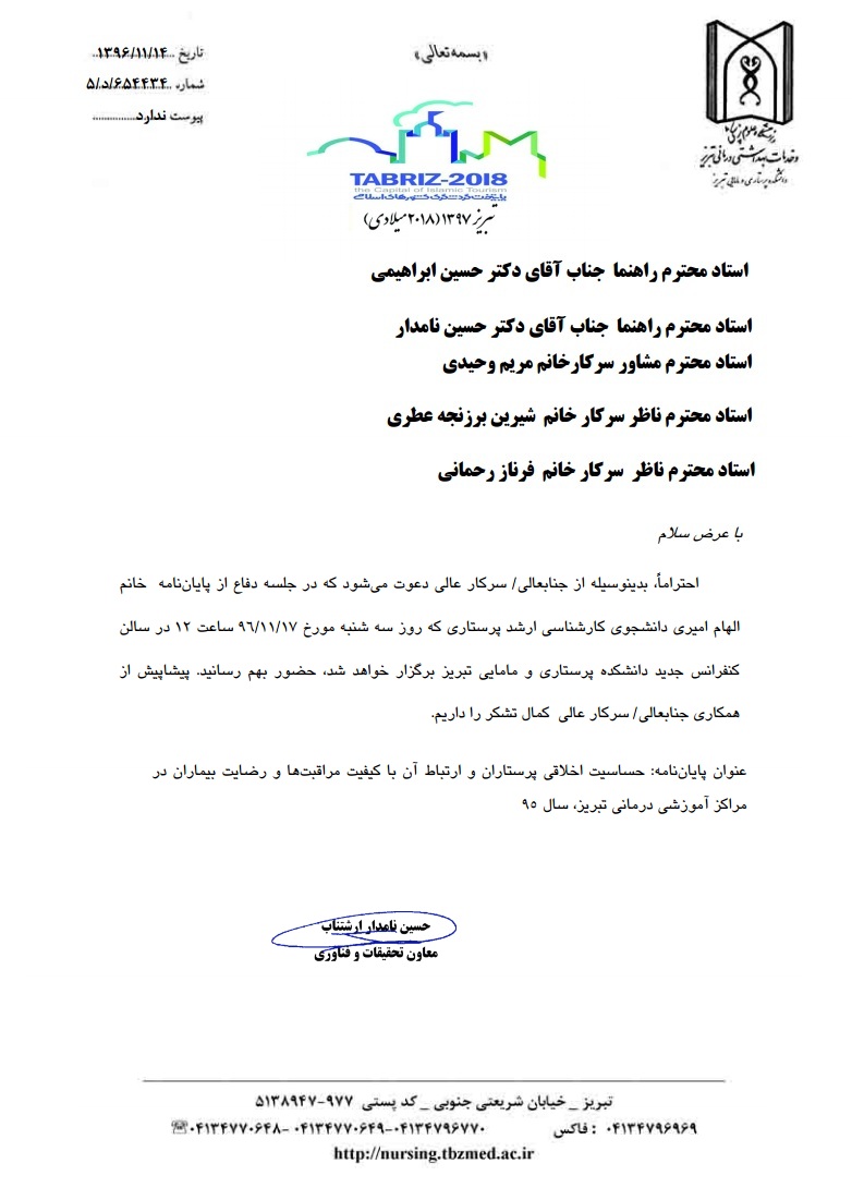 جلسه دفاع از پایاننامه خانم الهام امیری، دانشجوی کارشناسی ارشد پرستاری