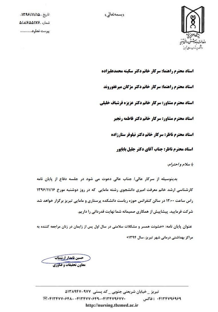 جلسه دفاع از پایاننامه خانم معرفت امیری، دانشجوی کارشناسی ارشد مامایی